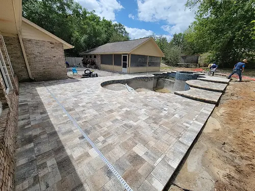 - Paver/Travertine Decks: Set on crushed concrete with sand finish.